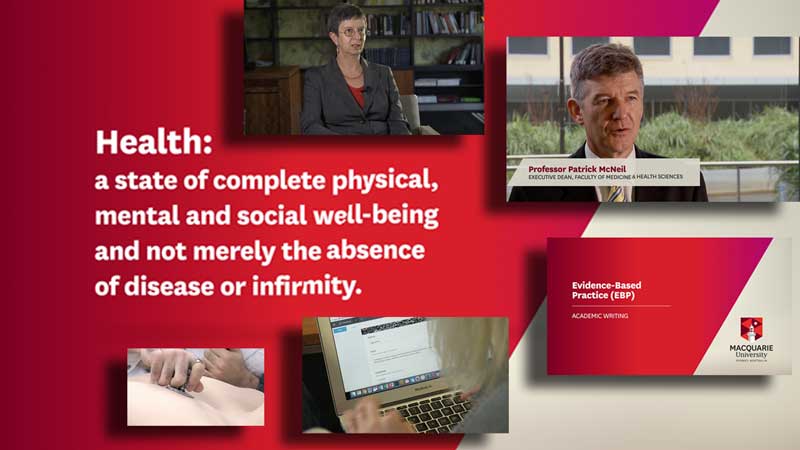 Working part-time over a period of 18 months, I collaborated with faculty-based learning designers, the Learning Innovation Hub and additional media producers (eg photographers, videographers, motion graphic artists). We worked closely with faculty unit Convenors, Subject Matter Experts (SMEs), researchers, lecturers and students to plan and produce the video clips. These ranged from relatively straight-forward presentation of PowerPoint slides (eg evidence-based practice, asking clinical questions, medical research referencing, patient-centred care) through to conference presentations, short interviews with doctors/researchers/clinicians, showcase clips (eg innovative approaches in medical student assessment), practical/competency-based demonstrations of key skills (eg Work Health and Safety (WHS), clinical protocols and safety) and mini documentary-style clips exploring a particular research topic.